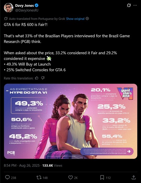 ويخطط نحو نصف المستجيبين لدعم Rockstar Games وشراء GTA 6 فور صدوره، ما يعكس الشعبية الكبيرة للعبة حتى في الأسواق التي تعد فيها تكاليف الألعاب عالية نسبيًا.