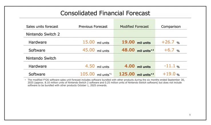 في المقابل، تراجعت مبيعات جهاز Switch الأصلي بنسبة 60% على أساس سنوي لتصل إلى 1.89 مليون وحدة فقط، مما دفع الشركة لتخفيض توقعاتها لهذا الطراز إلى 4 ملايين وحدة فقط خلال العام. لكن المثير للاهتمام أن نينتندو رفعت توقعاتها لمبيعات الألعاب من 105 ملايين إلى 125 مليون نسخة.